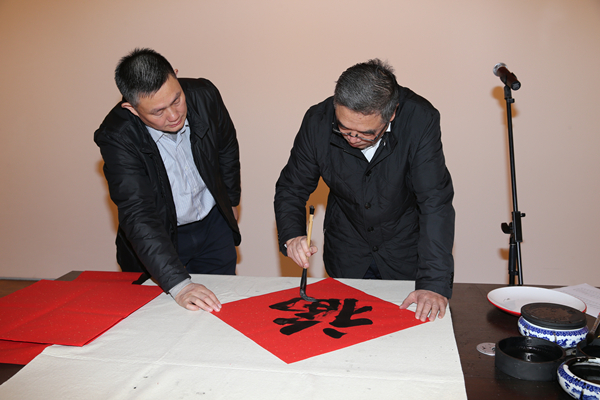 民进中央开明画院邵岩、李强、吴至录、崔伟、夏鹏程、刘长焕、刘铁成、王京涛,北京开明画院徐伟、封俊虎、王沛忠、李勇、陈群等书画家在现场挥毫泼墨,为现场居民和东城区文化馆书写了350多副春联和“福”字。中国书法家协会副主席、民进中央开明画院副院长言恭达虽然没能来到现场,但寄来了自己精心书写的春联,被现场群众一抢而空;邵岩专程从山东威海赶到北京参加活动,结束后来不及休息又马上往回赶;刘铁成推迟了自己回家的时间、李强调整了课程、夏鹏程老师一早从郊区赶来……书画家们不辞辛劳,无私奉献,用实际行动响应民进中央号召,为社区居民送上节日的祝福,树立了民进会员的良好形象。