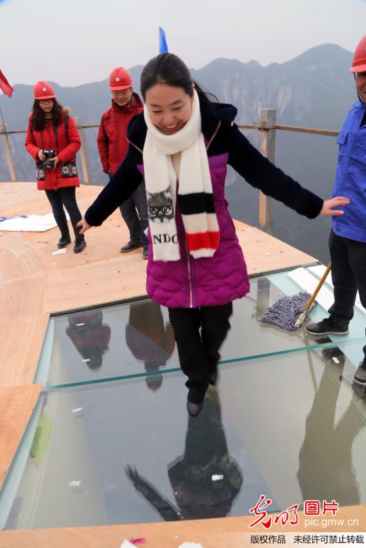 2015年2月11日,重庆云阳龙缸景区云端景观廊桥推举成功。图为人们在上面体验行走。