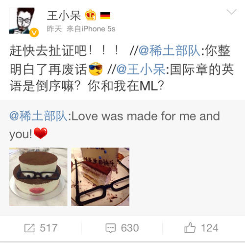 6月29日夜,章子怡在微博上为男友汪峰送出生日祝福,不仅展现了造型颇像汪峰的生日蛋糕,还附上一句“Love was made for me and you!”看得出二人感情正在你侬我侬阶段。而网友王小呆“捣乱”评论:“国际章的英语是倒序嘛?你和我在ML?”