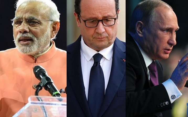 资料图:印度总理莫迪(左)、法国总统奥朗德(中)与俄罗斯总统普京(右)。