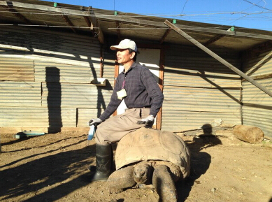这些乌龟个性温驯,不会攻击人类,园艺爱好者许希圣先生甚至骑上去,由此可观察到其体型庞大。(美国《世界日报》/Lucky Yu 提供)