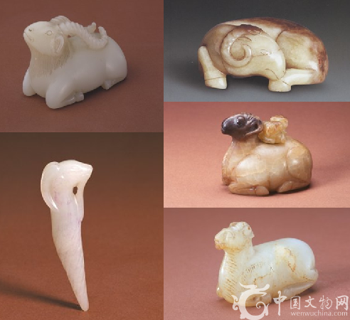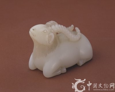 白玉卧羊,清,高5.8cm,长10.2cm。清代玉羊与前代风格略有区别,着重于动态的表现,且比前代更加写实,造型准确,骨骼、肌肉加以突出的表现。此白玉羊造型简洁明快,刀工精湛,打磨润泽,更因其质地洁白无瑕,使羊之温顺的性情与肥美的体态得以极好的展现。(北京故宫博物院杨捷)