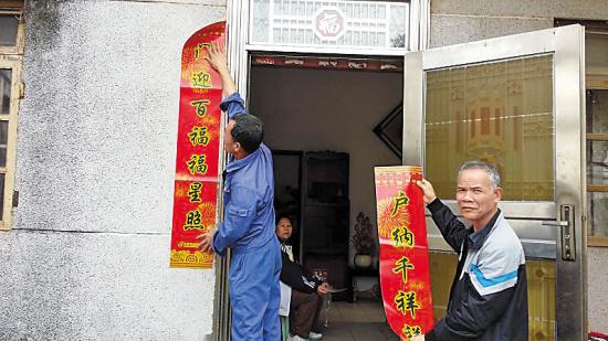 年三十,徐辉(右)与大哥贴春联,迎新春