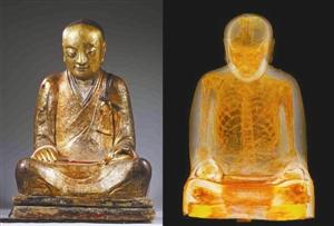 这尊中国古佛像的年代可追溯到11到12世纪。CT扫描发现佛像内部包裹着一具和尚的遗体,还处于冥想打坐状态。据悉,博物馆方面很早就确认,这尊佛像内部藏有高僧肉身,但在CT扫描之前并不知道其肉身器官已被摘除。