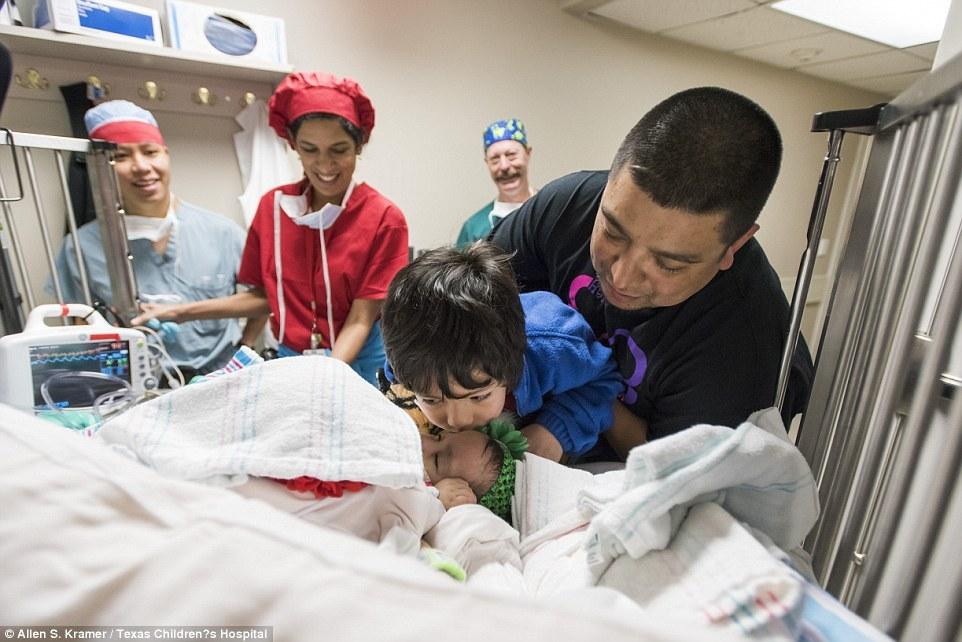 5岁的哥哥亲吻手术后的妹妹。