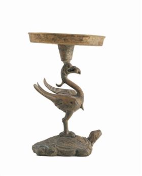 无独有偶,2004年安徽省天长市还出土过一件龟驮朱雀铜灯(图2,也收藏于安徽省博物院),此灯造型为一仰首伏地的龟,背上站立着一只口中衔珠的展翅朱雀,雀首顶着一个直壁平底的圆灯盘。两件朱雀造型的文物极为相像(如朱雀口中均衔珠),出土地点又如此相近,这就不得不提及汉代的“东阳城”。东阳城遗址位于今江苏省盱眙县,与安徽省天长市紧邻,长期以来盱眙、天长两地发现多座西汉大墓,出土大批极为精美的漆器、玉器和青铜器,有的漆器、陶片和瓦当上还书写有“东阳”二字。2009年发掘的盱眙大云山西汉墓群更是引起了极大轰动,前不久央视《探索发现》节目还做了好几集的纪录片。汉初开国功臣堂邑侯陈婴、汉武帝宠妃陈阿娇、吴王刘濞、江都王刘非都与这座东阳城有着千丝万缕的联系,因此东阳城周边发现多座西汉大墓也就不足为奇了。