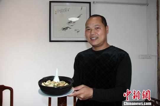 采访时“橘子哥”展示他做的酿豆腐 蔡欣欣 摄