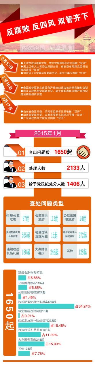 据中央纪委监察部网站2月24日通报,2015年1月,全国查处违反中央八项规定精神问题1650件,处理人数2133人,给予党纪政纪处分1406人。