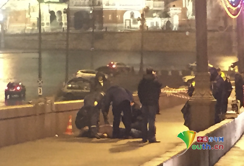 当地时间2015年2月28日,俄罗斯莫斯科,警察在鲍里斯-涅姆佐夫的尸体旁进行调查。据国外媒体报道,俄罗斯反对派政治家、前副总理鲍里斯-涅姆佐夫遭射杀身亡。据悉,事发时涅姆佐夫走在克里姆林宫附近的大街上,身份不明的凶手朝他开枪。涅姆佐夫在叶利钦在任时期曾任第一副总理,现猛烈批评总统普京,经常组织街头游行,并揭露官员贪腐,他原定在3月1号出席莫斯科一个反对派的大型游行?! ⊥计鹈篜avel Golovkin/东方IC