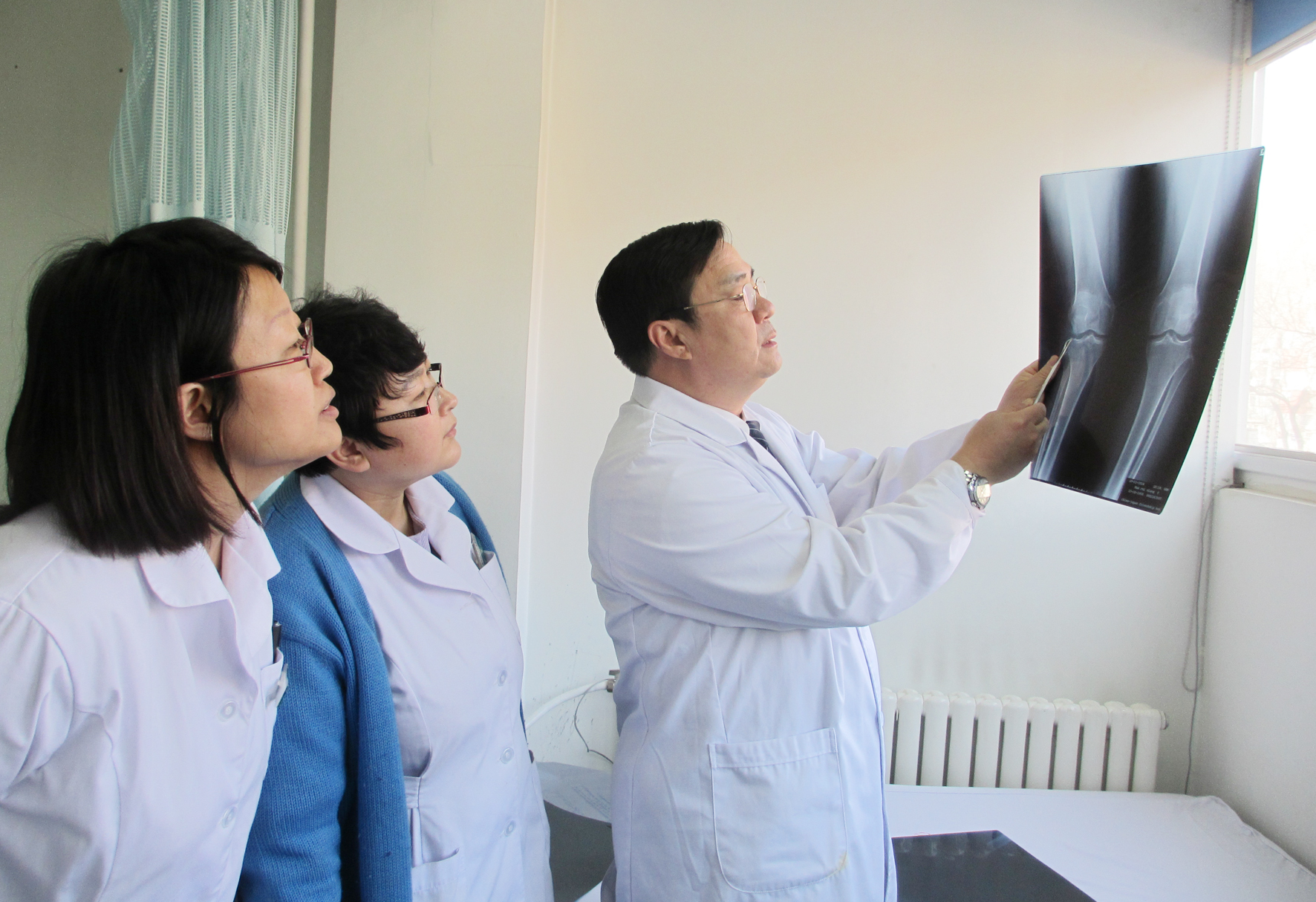 温建民委员(右)指导学生杨春苹(左)和卢晨看X光片。摄影  本报记者  李木元