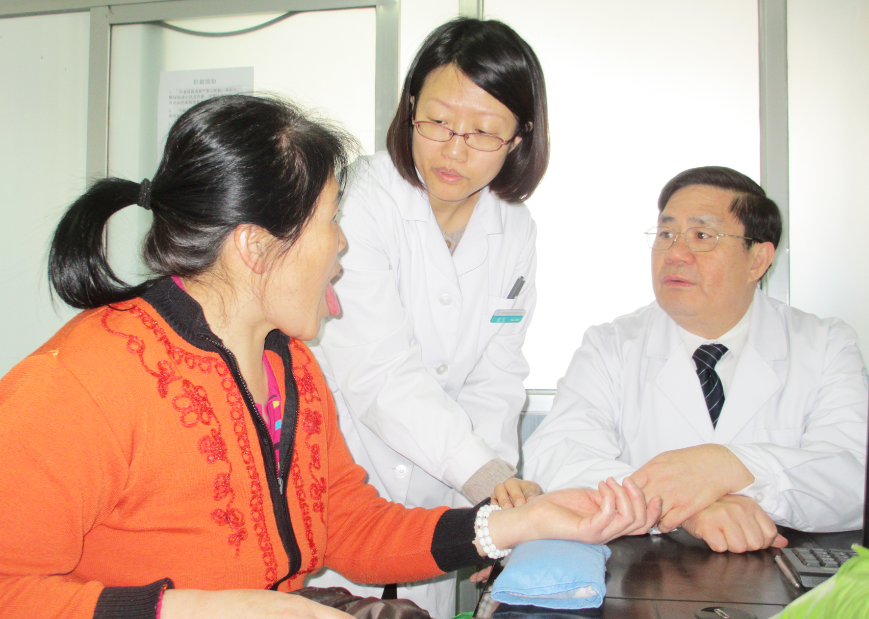 温建民委员(右)指导学生杨春苹(中)给患者号脉看舌象。摄影  本报记者  李木元
