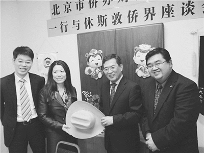 北京市侨办慰问团一行与休斯敦华侨华人座谈合影。