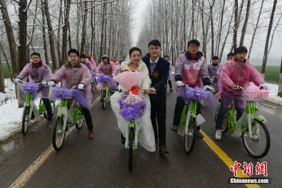 2月28日,安徽阜阳市颍泉区行流镇桅杆村,22岁青年时云涛在两公里的路上,用公共自行车迎娶新娘,别致又清新的方式引得路边行人纷纷叫好。据悉,阜阳市公共自行车管理中心免费提供30辆公共自行车。中新社发 启闻 摄 图片来源:CNSPHOTO (来自:中国新闻网)