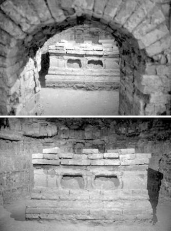 北京发现罕见规??绱昴乖崛? src= 大兴新发现的一座辽金时期墓葬的入口(上)和棺床(下)。新华社发
