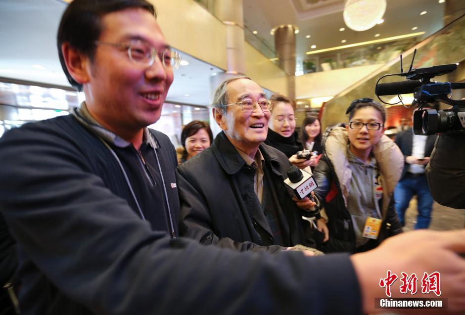 3月1日,参加全国政协十二届三次会议的委员陆续报到。厉以宁委员在北京铁道大厦报到。中新社发 刘震 摄