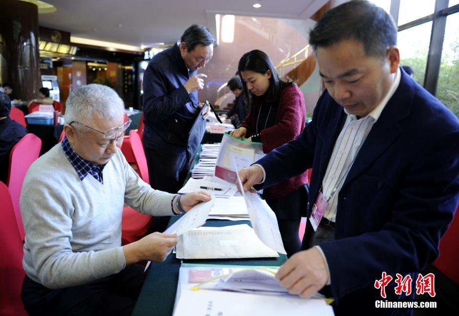 3月1日,工作人员为参加全国政协十二届三次会议的委员办理报到手续。中新社发 张斌 摄