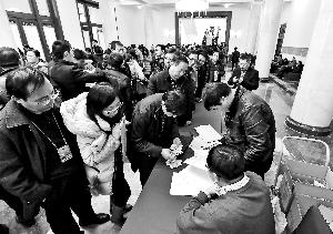 昨天,参加全国政协十二届三次会议采访报道的记者在北京全国政协礼堂领取证件。 新华社记者 李贺/摄
