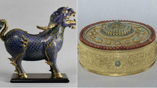图片说明:此次失窃的圆明园旧藏景泰蓝麒麟和金曼扎