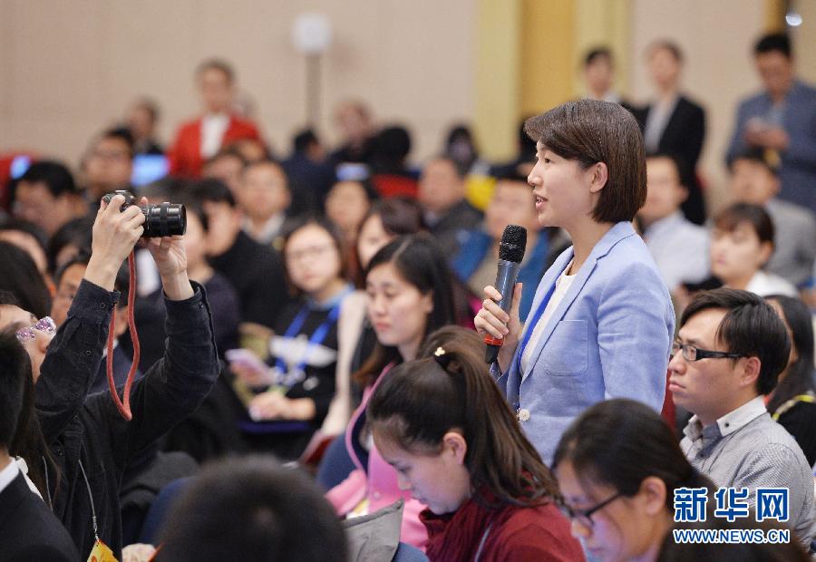 3月5日,十二届全国人大三次会议新闻中心举行记者会,邀请国家发展和改革委员会主任徐绍史就“经济社会发展与宏观调控”的相关问题回答中外记者的提问。这是记者在现场提问。新华社记者 李鑫 摄