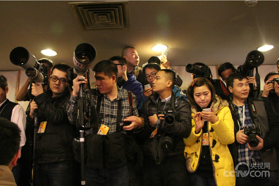 摄影台上记者们摩肩擦踵。