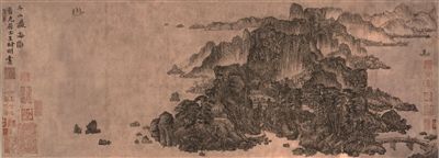 中国山水画发端于魏晋,顾恺之有《画云台山记》传世,唐人张彦远记述这一时期:“其画山水,则群峰之势,若钿饰犀栉。或水不容泛,或人大于山。”是作为人物画的衬景。南朝刘宋的宗炳《画山水序》说:“今张素绡以远映,则昆、阆之形,可围于方寸之内。竖划三寸,当千仞之高;横墨数尺,体百里之迥。”有人认为宗炳才是中国山水画的真正鼻祖。谢赫《古画品录》把前人的创作实践归纳为“六法”,自然不外山水画。至唐代吴道子为明皇作“蜀道写貌山水”,李思训、李昭道父子有《江帆楼阁图》、《明皇幸蜀图》存世。张璪再将自己的创作实践概括为“外师造化,中得心源。”经五代荆浩、关仝、董源、巨然,各自以不同生活区域的地形地貌为粉本,抽象概括出不同的皴法,呈现不同风格的画卷,把中国山水画推向成熟。北宋李成、范宽、郭熙,将这业已成熟的画种往更加精致、更加气势磅礴方向又推进一步。这就是我们遗憾在南京博物院无法见到的前半部山水画史,这些经典作品大都在台北故宫,幸运的是日本二玄社的仿真复制让我们能够看到这些名迹下真迹一等的风采。