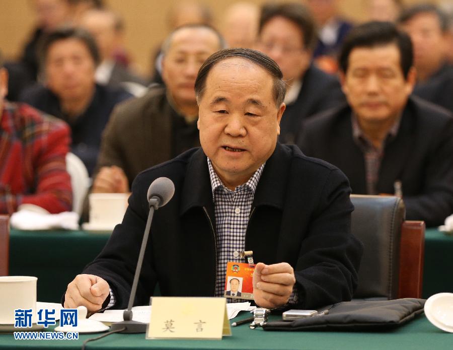 出席全国政协十二届三次会议的全国政协委员热议推动文艺繁荣发展、开创文化建设新局面,为实现中华民族伟大复兴的中国梦提供强大文化力量建言献策。莫言委员在发言时说,要把创作出无愧于时代的作品当做毕生事业和最高追求;要对未来充满希望,对中国梦的实现满怀信心;要洞察人心,向人民学习,从生活中索取新的艺术形象。新华社记者马占成摄