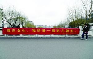 昨天下午2点多,现代快报记者来到了南京晓庄学院方山校区。在校园内一座小桥的围栏上,记者看到了“晓庄女生,我妈唯一指定儿媳妇”的横幅,横幅的落款是“南京晓庄学院学生会”。