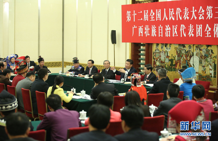 3月8日,中共中央总书记、国家主席、中央军委主席习近平参加十二届全国人大三次会议广西代表团的审议。 新华社记者兰红光摄