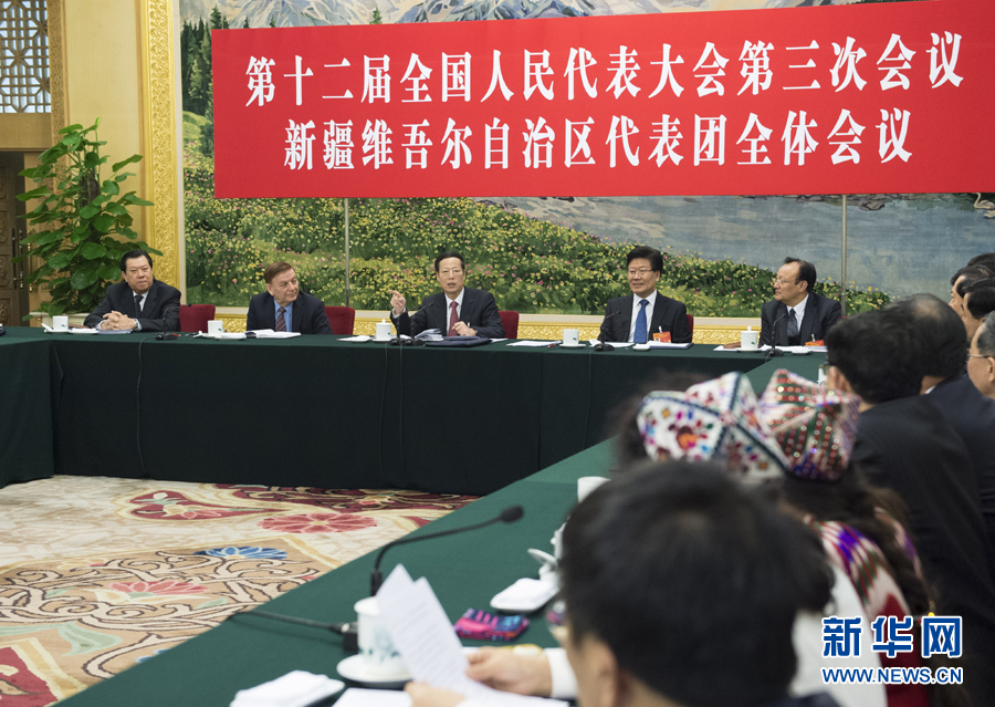 3月8日,中共中央政治局常委、国务院副总理张高丽参加十二届全国人大三次会议新疆代表团的审议。 新华社记者王晔摄