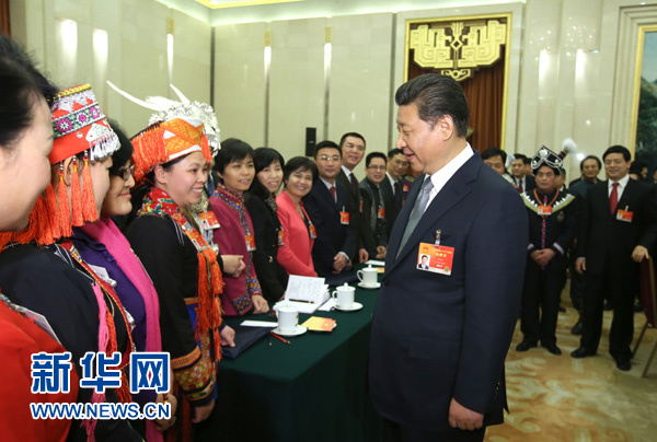 3月8日,中共中央总书记、国家主席、中央军委主席习近平参加十二届全国人大三次会议广西代表团的审议。这是习近平来到女代表中间,同她们亲切交谈,代表党中央、国务院,向广大妇女代表、妇女委员及全国各界妇女同胞,致以诚挚的节日问候。新华社记者 兰红光摄