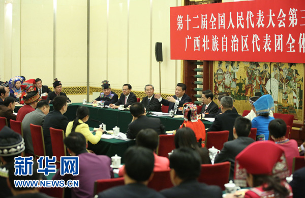 3月8日,中共中央总书记、国家主席、中央军委主席习近平参加十二届全国人大三次会议广西代表团的审议。 新华社记者兰红光摄