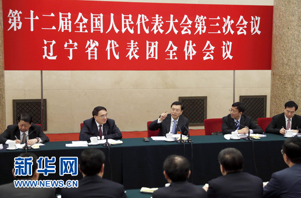 3月8日,中共中央政治局常委、全国人大常委会委员长张德江参加十二届全国人大三次会议辽宁代表团的审议。 新华社记者 鞠鹏 摄