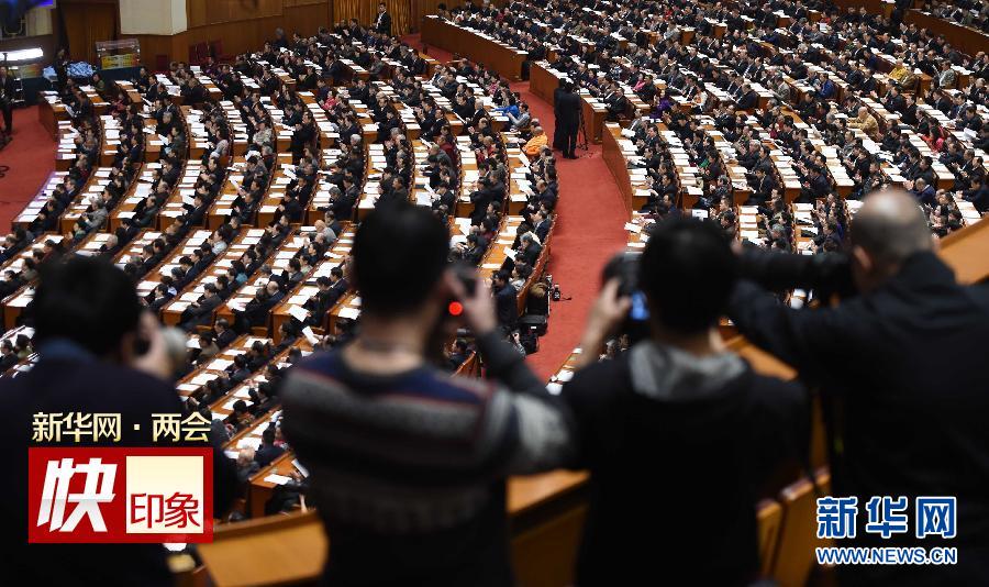 3月10日,全国政协十二届三次会议在北京人民大会堂举行第三次全体会议。这是记者在会场采访拍摄。 新华社记者 陈晔华 摄