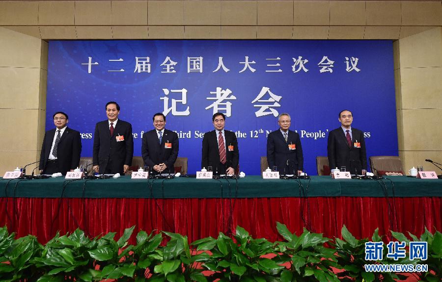 3月10日,十二届全国人大三次会议新闻中心举行记者会,邀请全国人大教科文卫委员会主任委员柳斌杰、全国人大内务司法委员会副主任委员王胜明、全国人大财政经济委员会副主任委员尹中卿、全国人大环境与资源?;の被岣敝魅挝痹?、全国人大农业与农村委员会副主任委员刘振伟,就人大专门委员会与人大工作回答中外记者提问。新华社记者 李然 摄