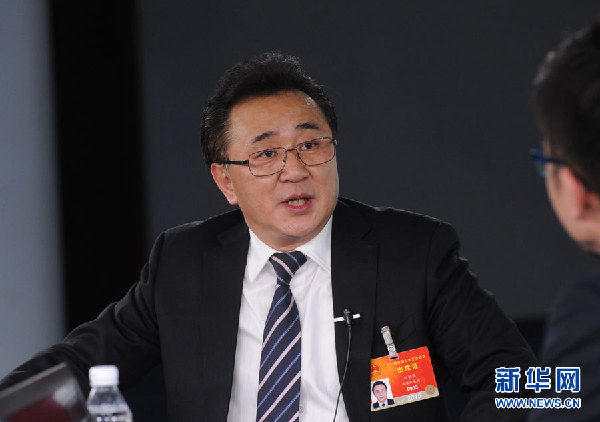2015年3月10日,全国人大代表、安徽省蚌埠市委副书记、市长白金明做客新华访谈,与网友分享他对依法治国、依法行政的体会和期待,以及介绍建设法治蚌埠的规划部署。图为白金明在访谈现场。 新华网 陈竞超 摄