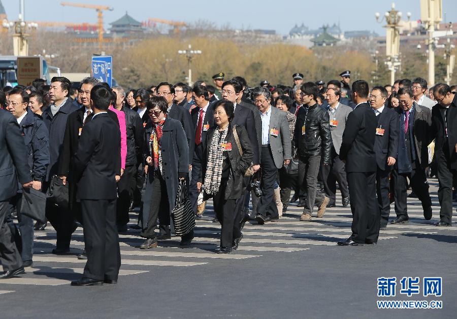 3月13日,全国政协十二届三次会议在北京人民大会堂举行闭幕会。这是全国政协委员抵达天安门广场。 新华社记者 吕迅 摄