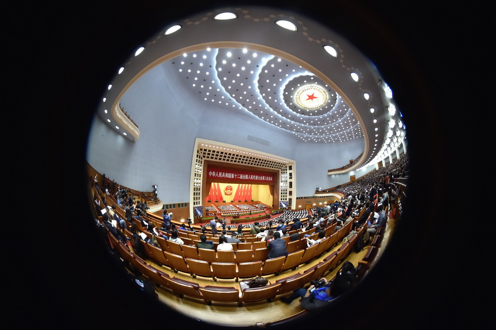 3月12日,十二届全国人大三次会议在北京人民大会堂举行第三次全体会议。记者用鱼眼镜头拍摄会场,让观众从另外一个变化的角度看大会会场。人民网记者 翁奇羽 摄