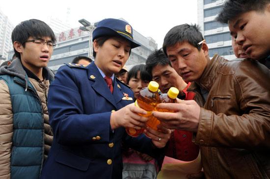 3月15日,工作人员在郑州火车站向旅客讲解真假饮品的鉴别方法。当日是“3·15”国际消费者权益日。全国各地举行各种活动,向广大消费者宣传法律知识和鉴别假冒伪劣产品知识,提供咨询和投诉服务,依法?;は颜叩恼比ㄒ?。新华社记者 朱祥/摄
