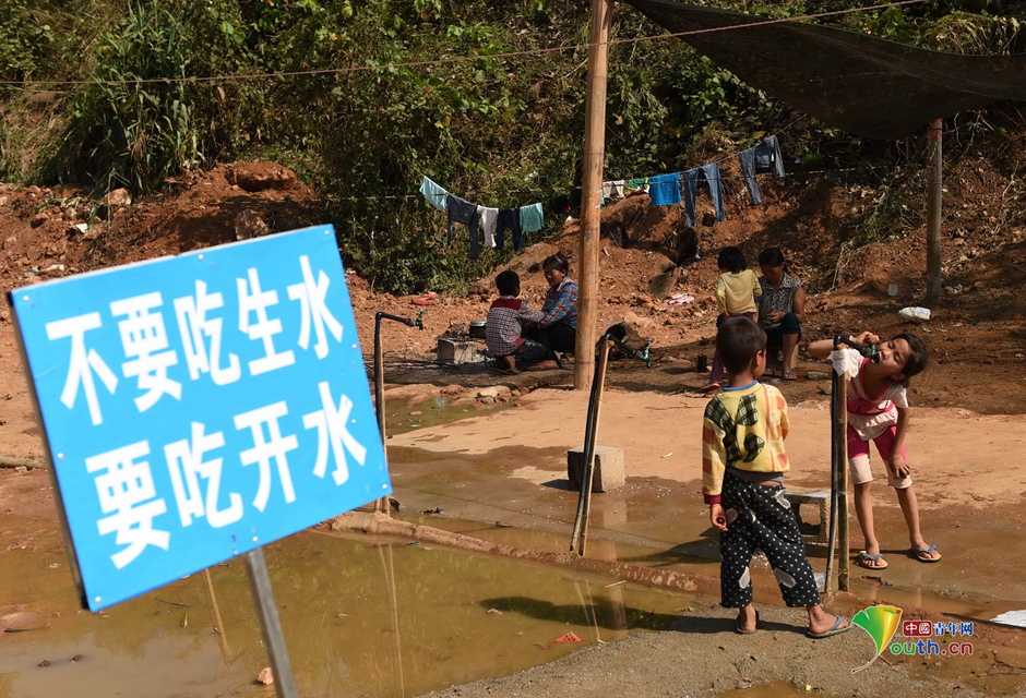 图为一些小难民在中缅边境的云南临沧南伞镇的集中安置点喝水,当地政府给他们提供住所和食物。图片来源:中国青年网