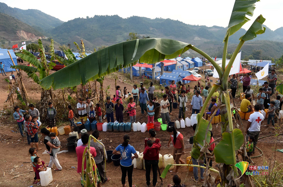 图为一些难民在中缅边境的云南临沧南伞镇的集中安置点准备排队打水。图片来源:中国青年网
