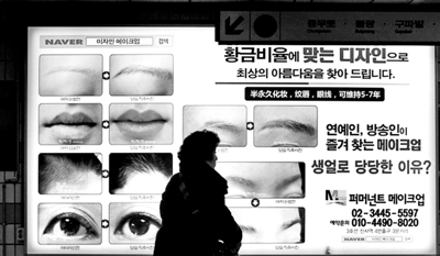 近日,韩国首尔,一名妇女经过地铁整容广告 新华社发