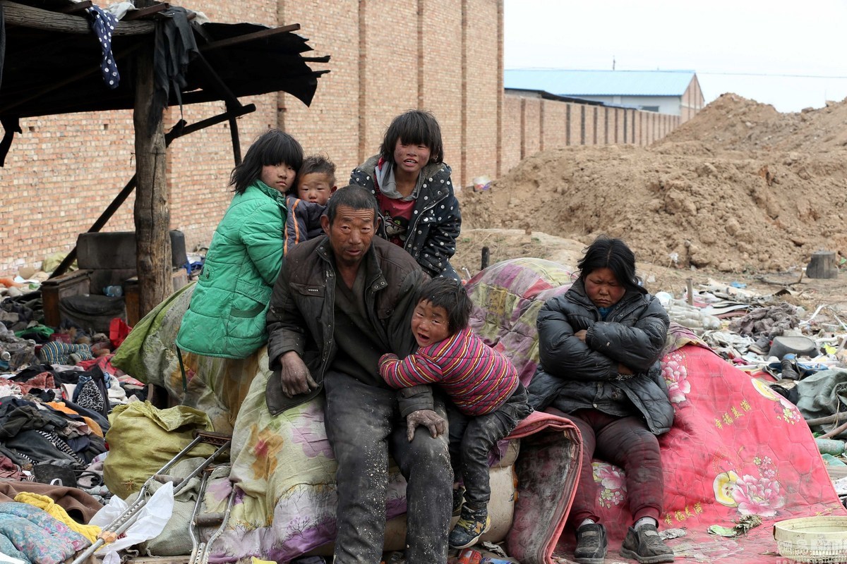 2015年3月10日,山西运城,11岁的杨园园上过两年学后因为没有户口所以辍学在家,父亲杨松事来自山东,今年50岁,因为事故,现在只能依靠拐杖行走。母亲李润玲是本地人,今年45岁,智障。杨园园还有三个弟弟妹妹,境遇和杨园园一样,至今黑户,兄妹四个自出生起就没有踏进过校门,他们陪伴父母住在简陋而且四处都是垃圾的房屋里。图为2015年3月10日,山西省运城市,杨园园一家人合影,杨园园说这是他们家第一次合影。