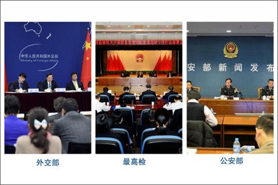 对内协调:在中央反腐败协调小组的统一部署下,各有关部门建立国际追逃追赃工作内部协调机制,组织开展追逃追赃专项行动,多管齐下,综合施策,形成了追逃追赃工作的整体合力。上图为外交部就中国追逃追赃工作举行中外媒体吹风会;最高检召开全国检察机关开展职务犯罪国际追逃追赃专项行动部署会;公安部举行“猎狐2014”专项行动新闻发布会。
