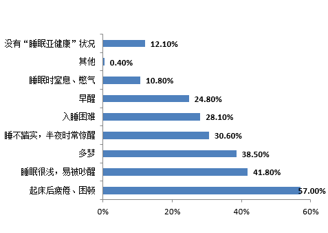 调查显示大部分人们存在睡眠亚健康状况,起床后疲倦困顿成为首要的表现,另外睡眠浅、多梦、半夜常被惊醒等、入睡困难、早醒等等也是较为常见的亚健康现象。认为自己没有睡眠亚健康现象的人只占12.1%。