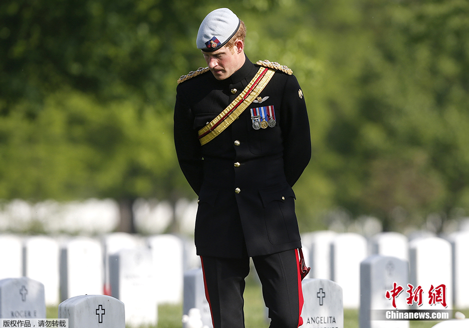 当地时间2013年3月10日,美国维吉尼亚州,阿灵顿国家公墓,哈里王子在公墓第60区内停步沉思。这里安眠着30万战士,包括冷战、二战、越南、伊战和阿富汗战争中阵亡的官兵。
