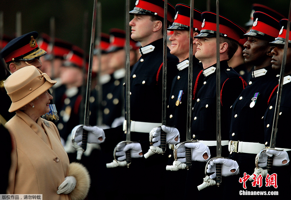 图为当地时间2006年4月12日,英国桑赫斯特皇家军事学院,女王伊丽莎白进行阅兵游行,她经过哈里王子身边时,对他微笑示意。