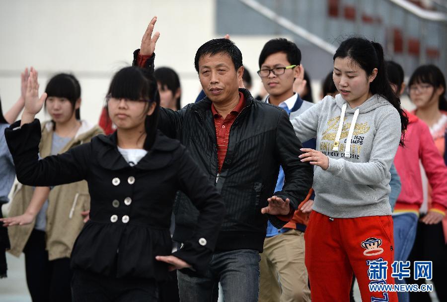 在江西中医药大学,淦菊保在体育课上学习太极拳(3月18日摄)。