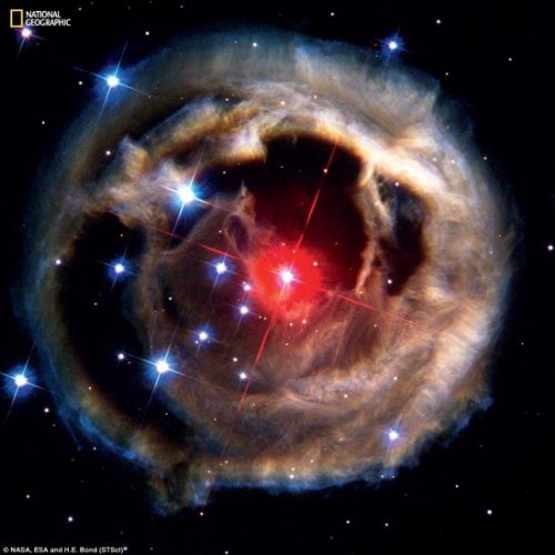这是位于麒麟座的V838Mon,距离约2万光年。这团星云本来是不发光的,2002年1月,它内部的恒星发生爆炸,照亮了这片星云。