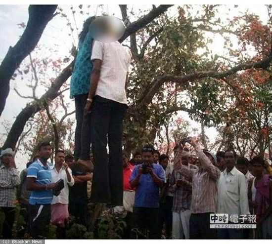 据台湾中时电子报3月20日报道,拉尼(Rani)爱上隔壁村的已婚男子,因为怀孕而不小心东窗事发被家人发现,没多久他们的尸体被发现挂在兰契( Ranchi)火车站附近的树上,而现场还有许多民众见状,拿起手机拍照。