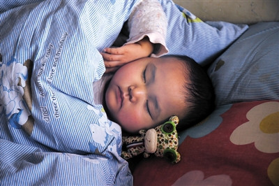 在医院的病房里,周宇航安静地睡着了,身边放着另一位小朋友送给他的玩偶,这是他最喜欢的玩具。